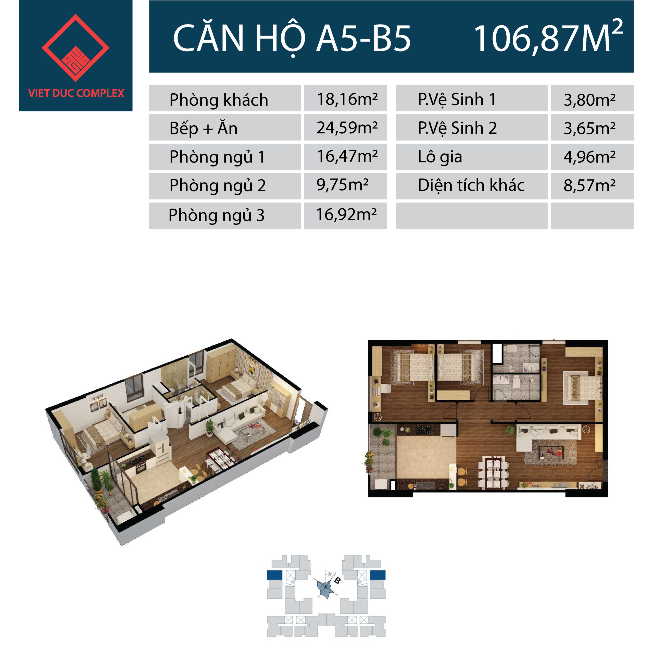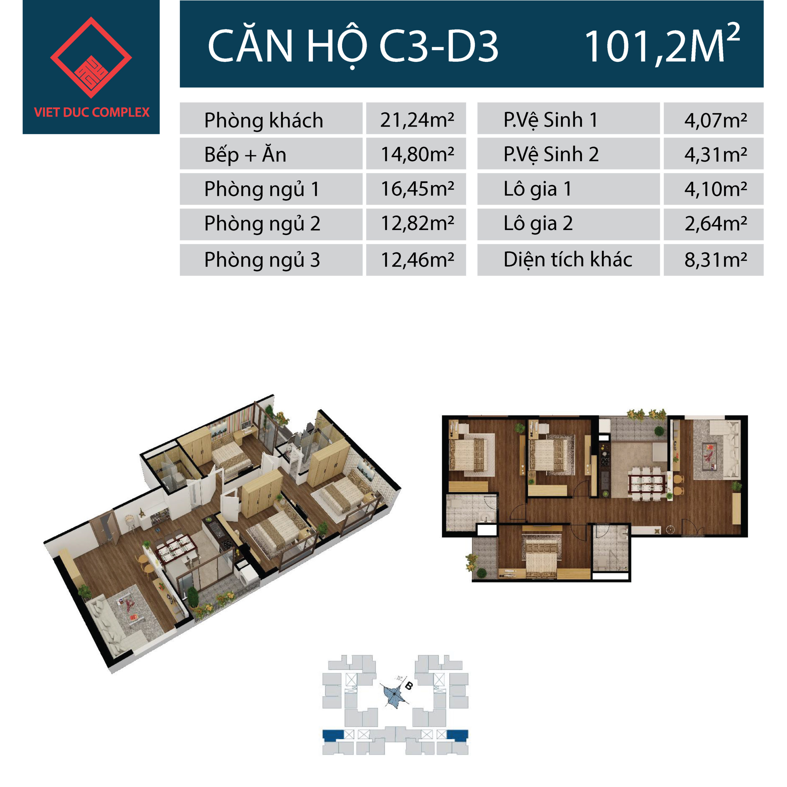 Chung cư Việt Đức Complex là tổ hợp văn phòng, dịch vụ và nhà ở được thiết kế theo phong cách hiện đại, năng động và chú trọng nhiều yếu tố văn hóa thuần việt gồm 704 căn hộ với các loại diện tích: 73 – 80 – 88 – 92 – 97 – 103 – 109 – 126 – 132 và 156.8 m2 đáp ứng nhu cầu và mục đich sử dụng đa dạng của khách hàng. Các căn hộ được thiết kế hiện đại, gồm 2 – 3 phòng ngủ.
